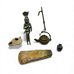 | Omschrijving | Lot diversen, waaronder een 20e eeuws Egyptisch bronzen beeldje en miniatuur dekselpotje, een 19e eeuws bronzen olielampje, een vuurstenen bijl, vermoedelijk Neolithicum en een aardewerken olielampje, Romeins |