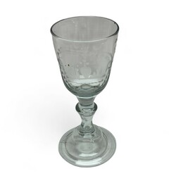 | Omschrijving | Lot van drie antieke glazen: één antiek glas, ca. 1800, met radgravure, voorstelling van een medaillon met urn of brandend hart. Met daarbij twee antieke 19e eeuwse borrelglaasjes. |