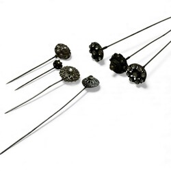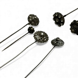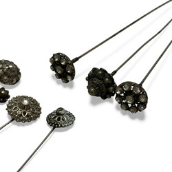 | Omschrijving | Lot met zilveren en ondele spelden, bestaande uit drie hoedenspelden, twee mustspelden en twee dasspelden. Enkele versierd met Zeeuwse knoop, roosgeslepen diamant andere met glasstenen. Vroeg 20e eeuws. |