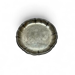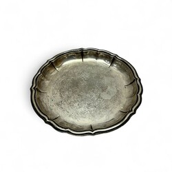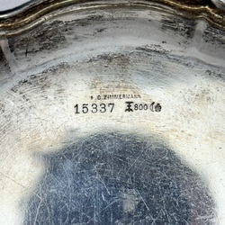 | Omschrijving | Een jaren ‘30 derde gehalte (800/1000) Duits zilveren presenteerschaaltje. Met gecontourneerde, geschulpte rand. Aan de onderzijde gemerkt ‘F.G. Zimmermann’. Tevens gemerkt met serienummer 15337, meesterteken Wilkens, ‘800’ en maantje en kroontje. |