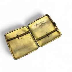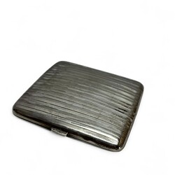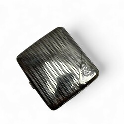 | Omschrijving | Een 20e eeuws Duits derde gehalte (800/1000) zilveren sigarettendoosje. Geribd model, gegraveerd met monogram en aan de binnenzijde verguld en met inscriptie ‘Souvenir van Annie’. Gekeurd ‘800’ op de drukknop. |