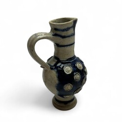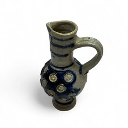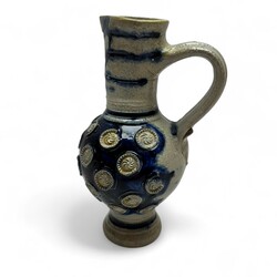 | Omschrijving | Een antiek Duits steengoed kruikje met oor, grijs-blauw, versierd met noppen. Westerwald, 17e eeuw. |