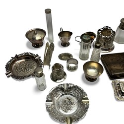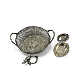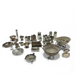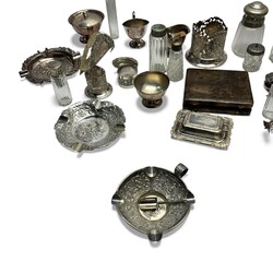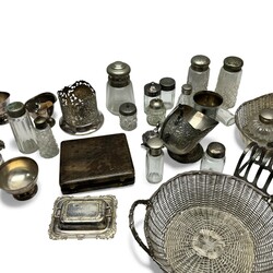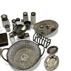 | Omschrijving | Een lot met diverse verzilverde artikelen, bestaande uit oa manden, Art Deco koffieboon lepeltjes in doos, strooiers en asbakken. |