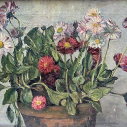 | Omschrijving | Schilderij, olieverf op doek. Voorstelling van bloemen in een bloempot. Rechtsonder gesigneerd Elisabeth Adriani-Hovy (Amsterdam 1873 - Utrecht 1957), gedateerd 1933. |