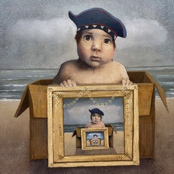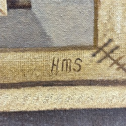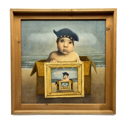 | Omschrijving | Een schilderij olieverf op paneel. Kind met hoed in doos aan het strand, met zgn droste effect. Gesigneerd HMS (Hermanus 1955-2017) Gelijst. |