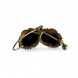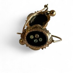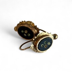 | Omschrijving | Een stel antieke 19e of vroeg 20e eeuwse 14 karaats (585/1000) geelgouden oorbellen, bezet met ovale onyx steen, ingelegd met kleine, gekleurde steentjes. Gemerkt met oud eikenblaadje. |