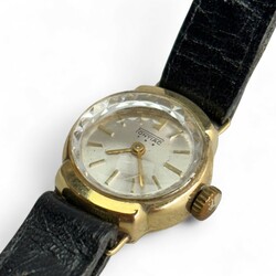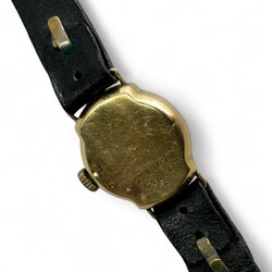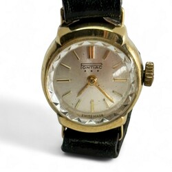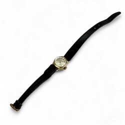 | Omschrijving | Een jaren '50 of '60 14 karaats (585/1000) geelgouden damespolshorloge, Pontiac, handopwinder, op zwart lederen band. |