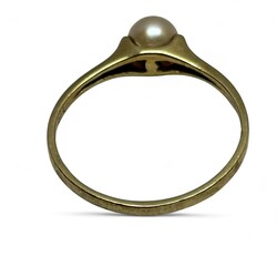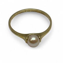 | Omschrijving | Een 20e eeuwse 14 karaats (585/1000) geelgouden damesring, bezet met parel. Aan de binnenzijde gemerkt ‘585’. |