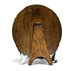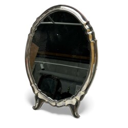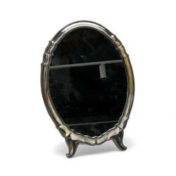 | Omschrijving | Een 20e eeuwse ovale spiegel in een derde gehalte (800/1000) zilveren lijst, gecontourneerd, op twee voetjes. Met een houten achterzijde. Gemerkt ‘800’, tevens met Hollands Z importkeur. |