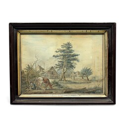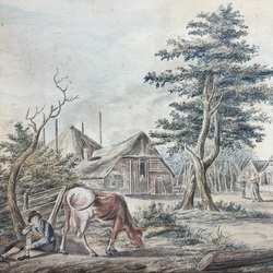 | Omschrijving | Aquarel op papier, voorstelling van een landschap met o.a. een boer bij een koe. Ongesigneerd, Hollandse School 19e eeuw. |