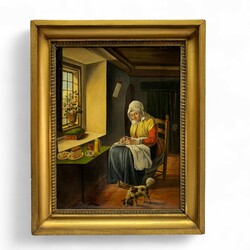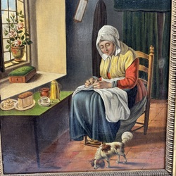 | Omschrijving | Olieverf op doek/board, interieurvoorstelling met zittende vrouw bij het raam en hond op de voorgrond. |