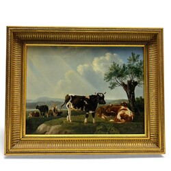 | Omschrijving | Schilderij, olieverf op paneel. Weidelandschap met boerin en koeien. Ongesigneerd, Hollandse School 19e eeuw. |
