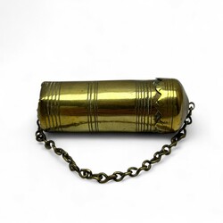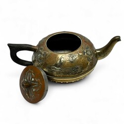| Omschrijving | Een vroeg 20e eeuwse geelkoperen theepot, met houten greep, gedreven en gegraveerd met florale decors, zeilboten en molen. Aan de onderzijde gemerkt ‘Klaas Dijkstra Sneek’. Met daarbij een antiek 18e of 19e eeuws messing tondeldoosje. |
