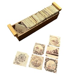 | Omschrijving | Gemengd lot van 60 tegels uit de 18e en 19e eeuw, met o.a. maritieme scènes, bloemmotieven, spotprenten, ornamenten en talloze varianten in blauw en mangaan. |