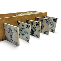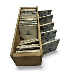 | Omschrijving | 32 tegels uit de 19e eeuw, overwegend blauwwit, met gestileerde florale motieven, hoekornamenten en enkele varianten in mangaan. |