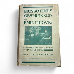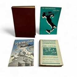 | Omschrijving | Lot van 4 boeken en schriften met thema Italië in WOII en Mussolini, waaronder 'Mussolini's gesprekken met Emil Ludwig', 'De bevrijding van Mussolini', 'De geschiedenis van een verraad' en 'Ciano's diary'. |