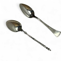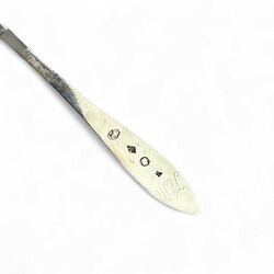 | Omschrijving | Lot divers klein tweede gehalte (835/1000) zilveren schepwerk, bestaande uit een theelepel en twee kleine lepeltjes, Niekerk Schoonhoven, twee zout- of mosterdlepeltjes, één bekroond met boer en één met eikeltje, twee kleine natfruitschepjes, één mr. Sustring, Sneek, de andere ‘MI4C’, een theelepel, vroeg 19e eeuws vorkje, MW = M.W. Warren, Sneek 1824. Met daarbij een verzilverd lepeltje met molen. |