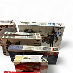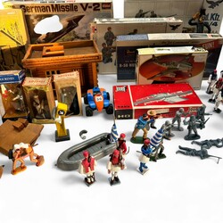 | Omschrijving | Lot divers speelgoed, o.a. diverse houten huisjes voor een cowboydorp (één in originele doos), drie Esci schaalmodeldozen met inhoud, 'Green Devils' (2x) en 'Sd. Kfz. 10/4 20 mm.a.a. Self-propelled gun', twee Revell bouwdozen, Eidai bouwdoos 'German Missile', diverse Starlux figuren, etc. |