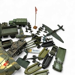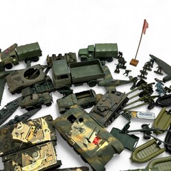 | Omschrijving | Lot divers speelgoed, oorlog. Voornamelijk kunststof, diverse merken, o.a. Timpo Toys, P.R.B. Bologna, Matchbox, Dinky Toys, Nichimo Japan, BIG West-Germany etc. |