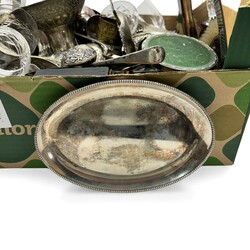 | Omschrijving | Groot lot divers verzilverd, waaronder grote schalen, twee bonbonmandjes, grote rozensteker, twee sigarettendozen, enkele asbakjes, waaronder één djokja, gemerkt ‘800’ |