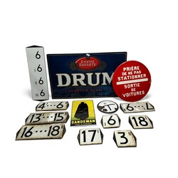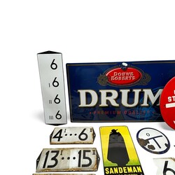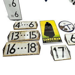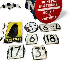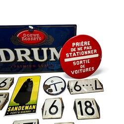 | Omschrijving | Lot diverse emaille borden en reclameborden, onder andere emaille huisnummers, onder andere 3I, 3 II, 17 I, 18 I en 9I, reclamebordje ‘Sandeman Port & Sherry’, Frans emaille bordje ‘Priere de ne pas stationner - sortie de voitures’ en blikken reclamebord, ‘Douwe Egerts Drum premium quality’ |
