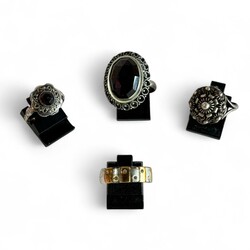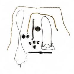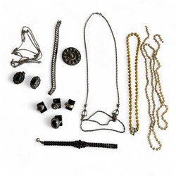 | Omschrijving | Lot diverse sieraden, waaronder een onedele armband bezet met granaat, diverse zilveren ringen, een tweede gehalte (835/1000) zilveren collier en twee faux parelcolliers |