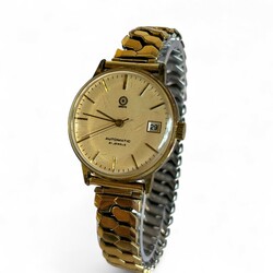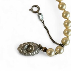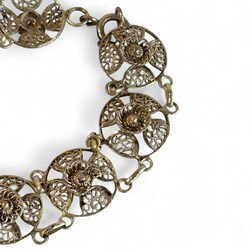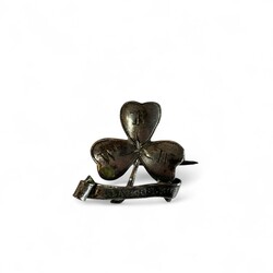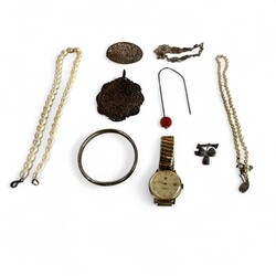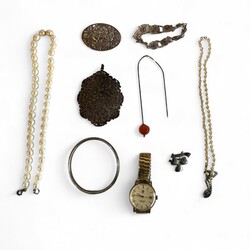 | Omschrijving | Lot diverse sieraden: een verguld jaren ‘60 automatisch herenhorloge, Ancre, op flexband, een filigrain zilveren damesarmbandje, een parelcollier aan eerste gehalte (925/1000) zilveren slot, tevens een faux parelsnoer aan eerste gehalte zilveren slot, een onedele broche en hanger, hoedenspeld met carneool (verbogen) en enkele tweede gehalte (835/1000) sieraden: broche met tekst ‘WRW het klaverbled’ en slavenarmband. |