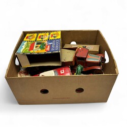 | Omschrijving | Lot diversen. Bestaande uit Sinterklaas artikelen, twee blikken autos's, toverlantaarn glaasjes, losse doos voor een schuco garage, etc. |