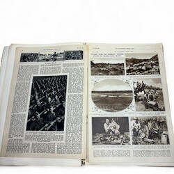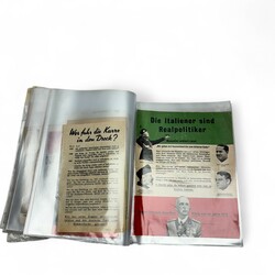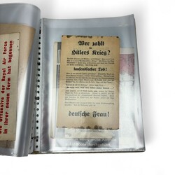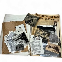 | Omschrijving | Lot van 2 mappen gevuld met krantenartikelen en foto's uit WOII, op de foto's staan soldaten en voertuigen, ook zitten er strooipamfletten en brieven (Feldpost) bij. |