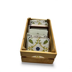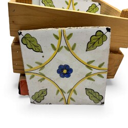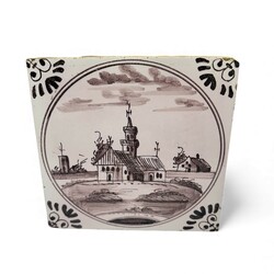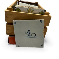 | Omschrijving | Lot diverse tegels, 18e tot 20e eeuw. Blauw-wit, mangaan en polychroom, o.a. 19e eeuwse ornamenttegel met bloem en bladeren. |