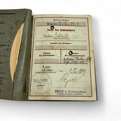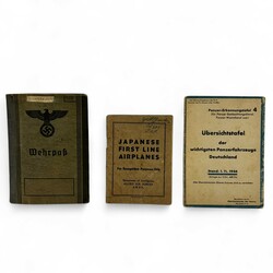 | Omschrijving | Lot van drie WOII documenten waaronder een Wehrpas van Anton Gefreiten Goberitz, een overzichtstabel voor Duitse gepantserde voertuigen en een (geallieerde) overzichtstabel voor Japanse vliegtuigen. In de militaire werkpas staat dat Anton is geboren op 12 maart 1907 en in dienst is geweest als kanon commandant bij Kwk 4,7cm. |