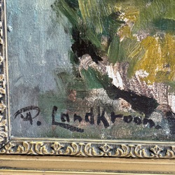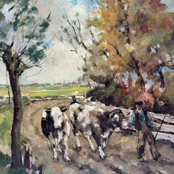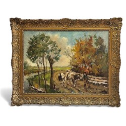 | Omschrijving | Schilderij, olieverf op doek. Boer en knecht met twee koeien op een landweg. Linksonder gesigneerd Piet Landkroon (Amsterdam 1907 - 1997). In vergulde ornamentenlijst. |