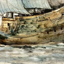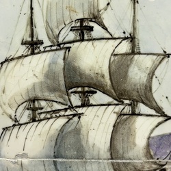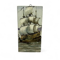 | Omschrijving | Tweedelig polychroom aardewerken tegeltableau, voorstellende een 17e eeuws galjoen met vol tuig. Gemonteerd op hout. Fabrikant onbekend, maar toegeschreven aan De Distel, Amsterdam. |