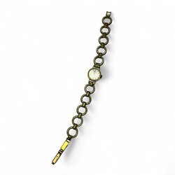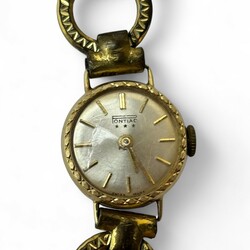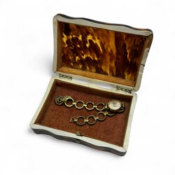| Omschrijving | Een jaren ‘50 dameshorloge Pontiac, op vergulde band, in een antiek 19e eeuws schildpad lepeldoosje |