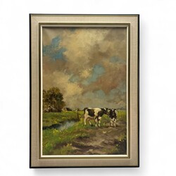 | Omschrijving | Schilderij, olieverf op doek. Koeien in de wei, met op de achtergrond een boerderij. Linksonder gesigneerd Sjoerd de Vries (Franeker 1909 - Alkmaar 1996) |