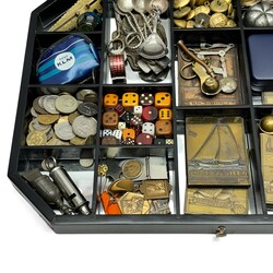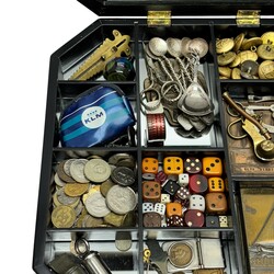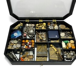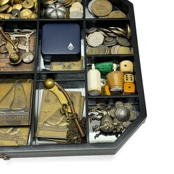 | Omschrijving | Een 20e eeuwse tafelvitrine gevuld met curiosa, onder andere bronzen penningen skutsjesilen, bootsmanfluitje, verzameling munten en dobbelstenen, divers schepwerk, etc. |