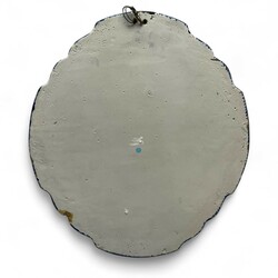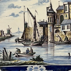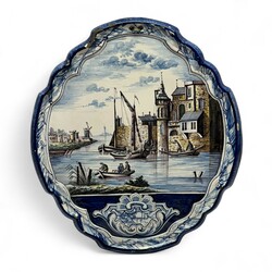 | Omschrijving | Een antieke aardewerken plaquette, ongemerkt, Tichelaar Makkum, ca. 1900. Gecontourneerde, blauw-witte en gemarmerde rand, aan de onderzijde een cartouche, centraal een polychrome voorstelling van schepen bij een stad of kasteel. |