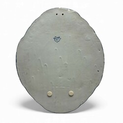 | Omschrijving | Ovaalvormige Tichelaar Makkum plaquette met polychroom landschap en decoratieve rand. |