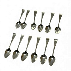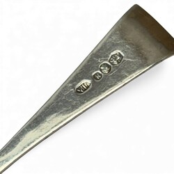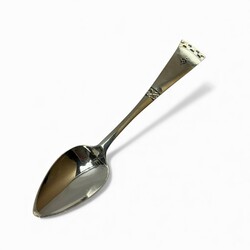 | Omschrijving | Lot van twaalf tweede gehalte (835/1000) zilveren theelepels, taps toelopende steel met gegraveerd patroon. Gemerkt met minervakopje, lopende leeuw, meesterteken AP = A. Pluut jr., werkzaam te Schoonhoven tussen 1915 en 1942, jaarletter H (1917). |