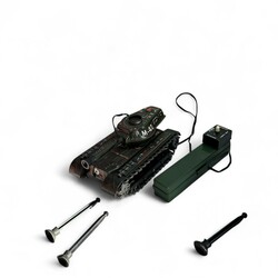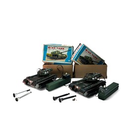 | Omschrijving | Lot van twee jaren '70 blikken en kunststof speelgoedtanks in originele doosjes, op batterij, met afstandsbediening. Doosje met tekst 'Battery Powered M-40 Tank Remote Control Shooting'. Fabrikant TM, Japan. Beide met losse, afvuurbare kogels. |