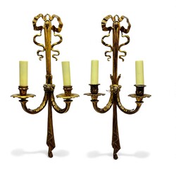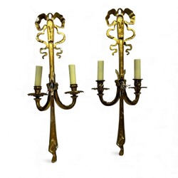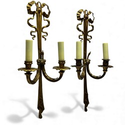 | Omschrijving | Lot van twee 20e eeuwse bronzen wandkandelaars, Seize stijl, met strikmotieven aan de bovenzijde. |