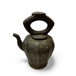 | Kavel | 2873. Twee teakhouten Indische sculpturen, een messing ketel en een antieke Birmese marjonetten pop. |