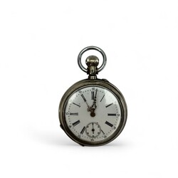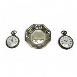 | Omschrijving | Lot divers: twee antieke zakhorloges, waaronder één in derde gehalte (800/1000) zilveren kast. Met daarbij een achtkantig opengewerkt tweede gehalte (835/1000) zilveren schaaltje. |