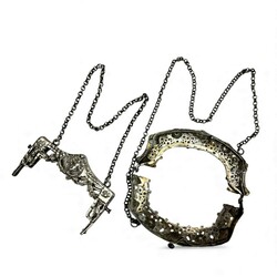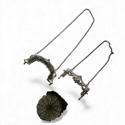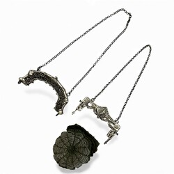 | Omschrijving | Lot van twee antieke 19e eeuwse tweede gehalte (835/1000) zilveren beursbeugels, beide opengewerkt en aan jasseroncollier. Eén gemerkt met jaarletter V (1855) en meesterteken ‘WK5’ = wed. Jacob A.Gz. Kooiman, werkzaam te Schoonhhoven tussen 1854 en 1856. De andere met voorstelling van een figuur met weegschaal, guirlandes en rozetten, jaarletter C, meesterteken ‘IDS’ = Jacobus Doekes Smeding, werkzaam te Leeuwarden vanaf 1795. Met daarbij een kralentasje. |