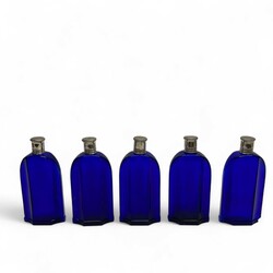 | Omschrijving | Vijf antieke kobalt blauwe parfumflakons met verzilverde doppen, Frans of Duits. |