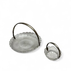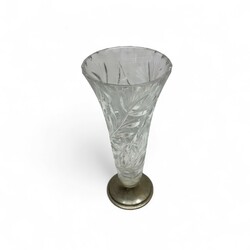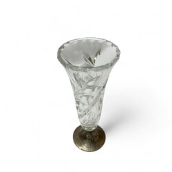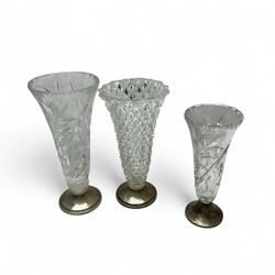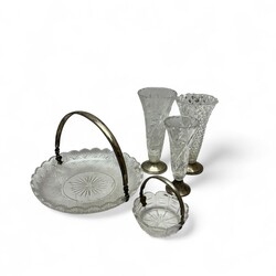 | Omschrijving | Een lot bestaande uit drie kristallen vazen, een presenteerschaal en suikerbakje. Alles met 2e gehalte (835/1000) zilveren voeten en hengels. |