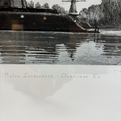 | Omschrijving | Kleurenets op papier, 'Molen Zeldenrust - Dokkumer Ee'. Linksonder gesigneerd Wim Bettenhausen (Den Haag, 1942), gedateerd 1998. Oplage 10/35. |