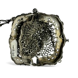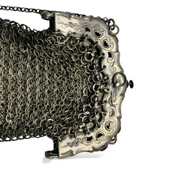 | Omschrijving | Een antiek 19e eeuws tweede gehalte (835/1000) zilveren beursbeugeltje aan maliënkoldertasje. Gemerkt met lopende leeuw, minervakopje en jaarletter N (1872). |