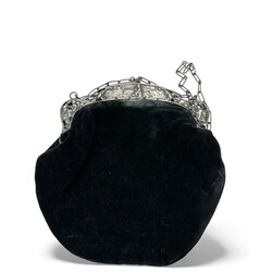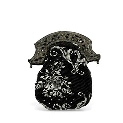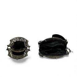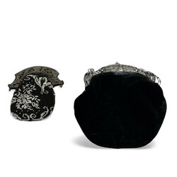 | Omschrijving | Een antieke 19e eeuwse tweede gehalte (835/1000) zilveren beursbeugel, opengewerkt, aan zwart-wit kralentasje. Met daarbij een tweede gehalte (835/1000) zilveren tasbeugel, ook opengewerkt, met voorstelling van een vissende man. Aan een zwart fluwelen tas. |