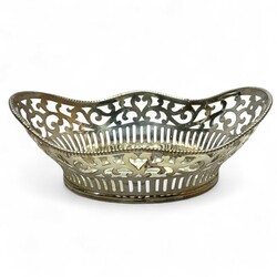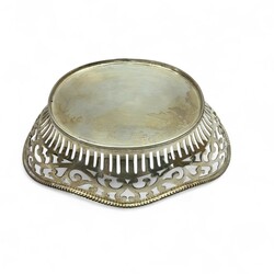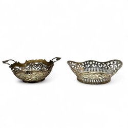 | Omschrijving | Lot van twee bonbonmandjes: één 20e eeuws tweede gehalte (835/1000) zilveren bonbonmandje, Louis XV stijl, met gecontourneerde rand, zaagwerk in o.a. ruitmotieven en twee grepen met rocailles. Gemerkt op één van de grepen met jaarletter P (1925), op de onderrand met lopende leeuw, en aan de onderzijde met minervakopje en meesterteken L113 = mr. L. Marcelis, werkzaam te Willige Langerak, Voorschoten en Apeldoorn van 1922 tot 1935. Met daarbij een 20e eeuws verzilverd bonbonmandje. Gecontourneerd model, met cannelures en krulmotieven, aan de bovenzijde met parelrand. Gemerkt ‘Pleet’. |